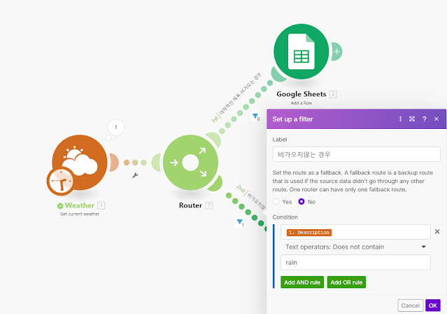액션에 대한 동작으로 우리는 라우터를 선택하는 것이지, 이렇게 하나의 라우터에 두개의 필터를 적용하도록 구글시트를 드러그로 선택하고 카피-페스트로하나를 더만들겠습니다. 이렇게 두개의 필터를 만들면 구체적인 .... 두개의 라우터를 통해 시트에 도달하도록 합니다.